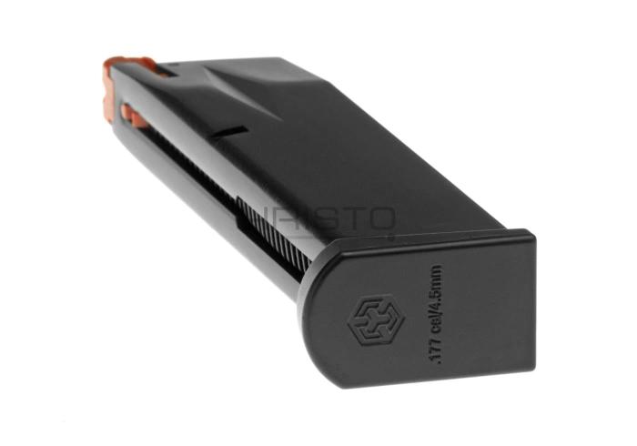 S kapacitetom za oko 15–17 airsoft kuglica, idealan je za brze, agresivne mečeve i pruža odličnu autonomiju između punjenja. Sustav ventila pažljivo je konstruiran za optimalnu potrošnju CO2, što omogućuje veći broj hitaca po kapsuli u odnosu na standardne spremnike.