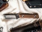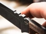 Tanto oštrica od čelika D2 debljine čak 5,6 mm u crnom stonewash finišu daje nožu robusnost i izdržljivost potrebnu za teške zadatke. Full tang konstrukcija i konturirane drške od smeđe Micarte, u kombinaciji s čvrstim bolsterima, osiguravaju siguran i udoban hvat. Izraženi utori na hrptu oštrice omogućuju preciznu kontrolu pri rezanju.