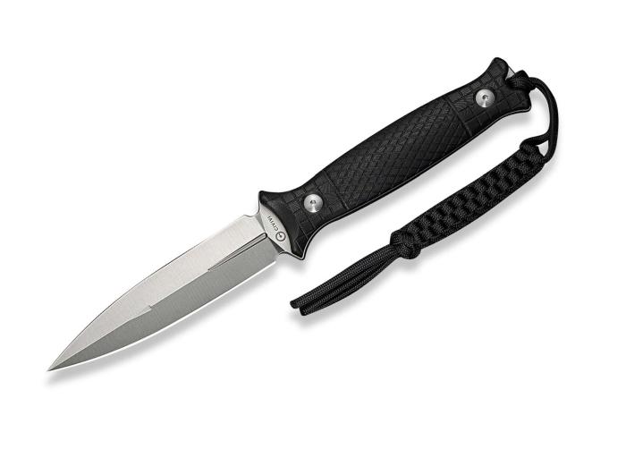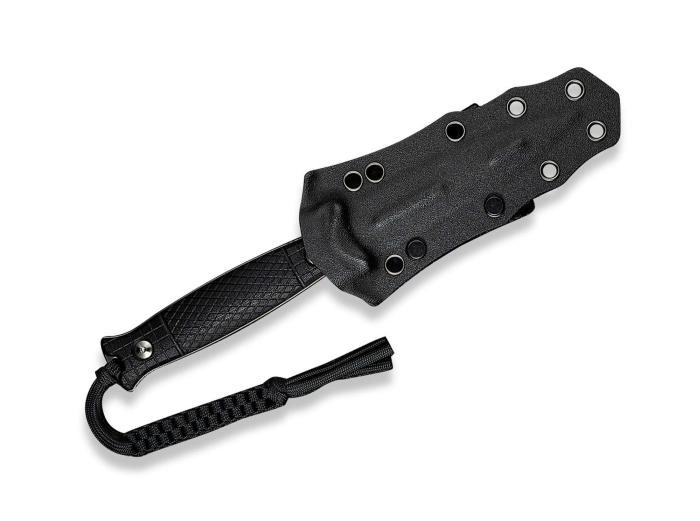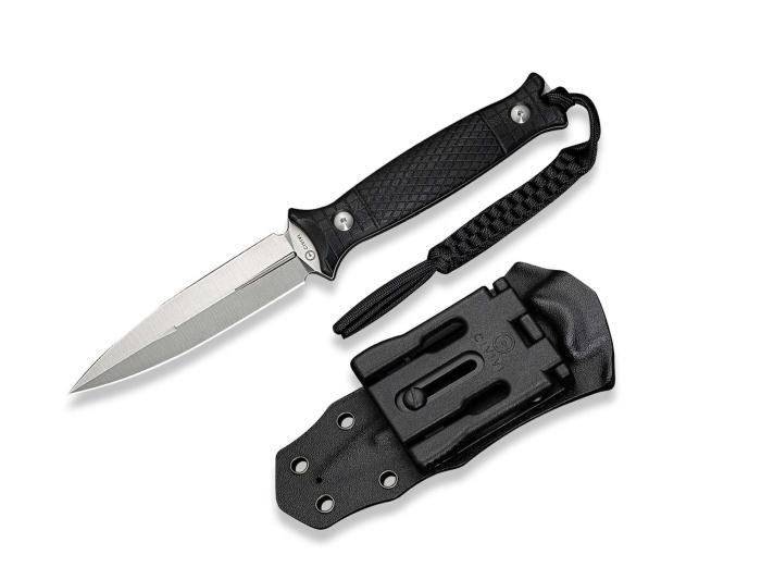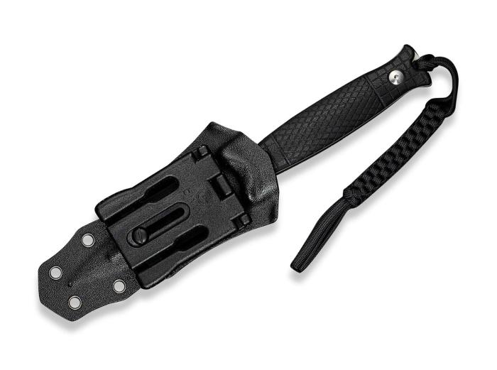 Drška od crnog G10 materijala ergonomski je oblikovana i ima teksturiranu površinu, čime osigurava siguran i čvrst hvat čak i u mokrim uvjetima. Nož dolazi s Kydex futrolom, kopčom za pojas i rupom za vezicu, omogućujući razne opcije nošenja i brz pristup kada je to potrebno.