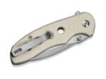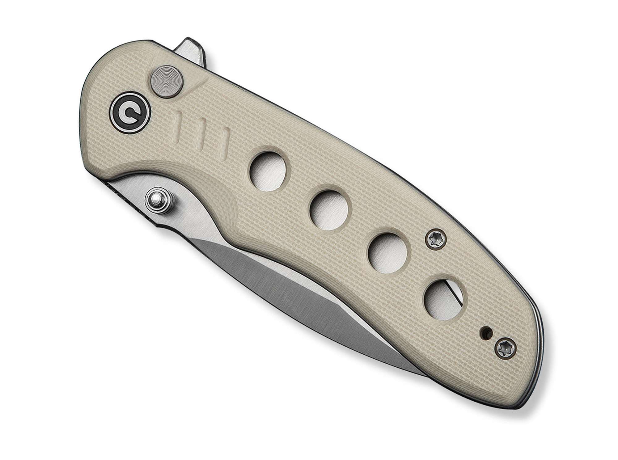 Perforirana drška izrađena od kremasto bijelog G10 materijala ne samo da smanjuje ukupnu težinu noža, već i pruža čvrst i ugodan hvat. Zahvaljujući reverzibilnoj tip-up džepnoj kopči, nož se lako i diskretno nosi, čineći ga idealnim za EDC entuzijaste i praktične korisnike.