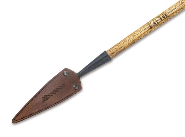 Kopljena oštrica izrađena je od ugljičnog čelika 1045, a drška od tvrdog drveta. U paketu je uključen kožni štitnik.