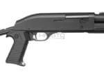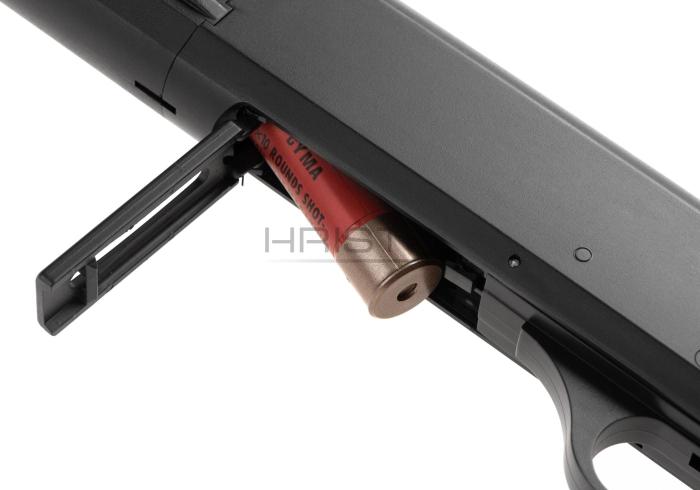 Izrađena od visokokvalitetnog ABS polimera, ova 780–900 mm duga opružna replika sačmarice puni se putem izmjenjivog spremnika u obliku standardne sačmene patrone kapaciteta 30 kuglica. Teži oko 1500 g i ispaljuje tri kuglice odjednom iz tri unutarnje cijevi, koristeći klasični „pump-action“ mehanizam repetiranja.