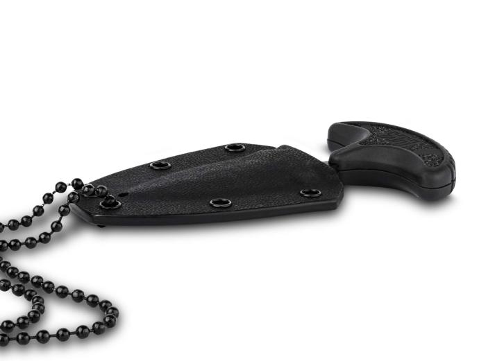 Simetrična drška izrađena je od izdržljivog FRN materijala (polimer ojačan staklenim vlaknima) i nudi siguran hvat u svim uvjetima zahvaljujući posebno teksturiranoj površini s prepoznatljivim HK uzorkom. Heckler & Koch FX02 fiksni nož dolazi s čvrstom simetričnom Kydex futrolom inspiriranom OSS Lapel Dagger modelom, koja se može nositi oko vrata pomoću priloženog lančića s kuglicama. Idealan je za diskretno nošenje i brzi pristup kada je najpotrebnije.
