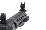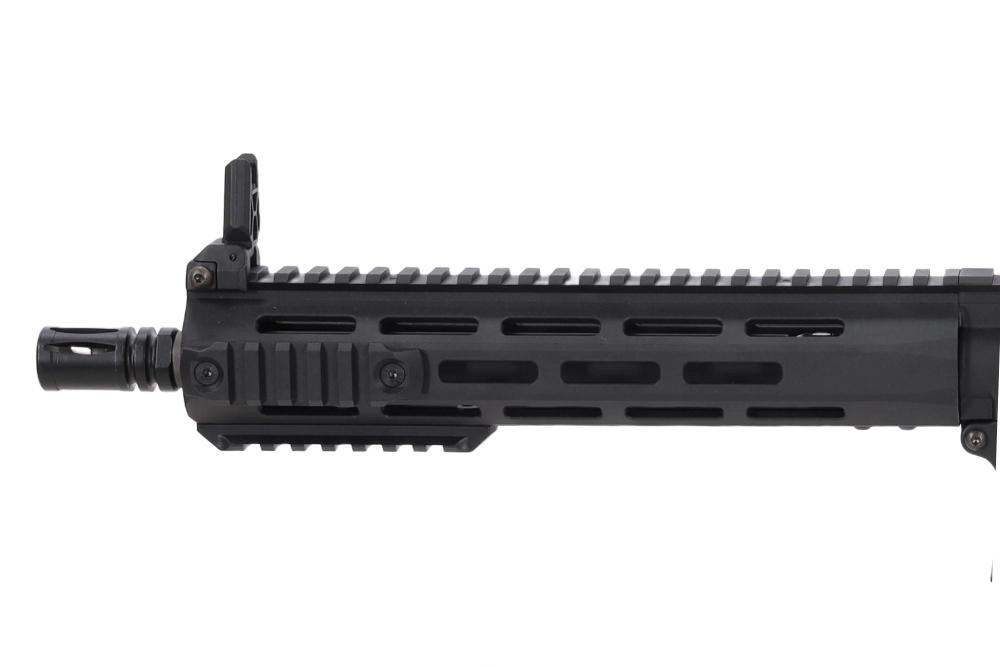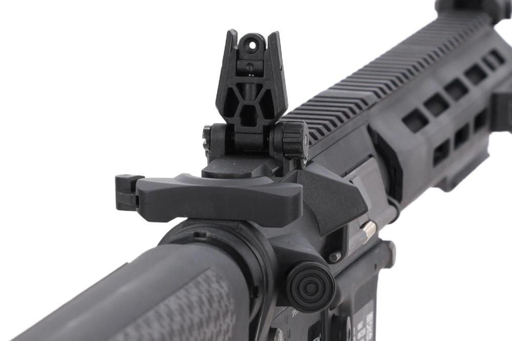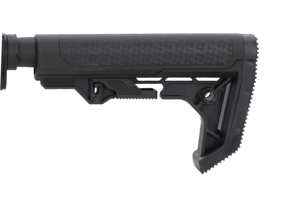 Light Ops Stock je minimalistički kundak male mase i modernog dizajna, s gumenim protukliznim umecima na objema stranama naslona za obraz te karakteristično zakrivljenom gumenom zakočnicom koja udobno leži na ramenu. Prednji dio čini M-LOK rukohvat s mogućnošću dodavanja RIS segmenata, a na vrhu replike nalaze se sklopive mehaničke nišanske sprave.?