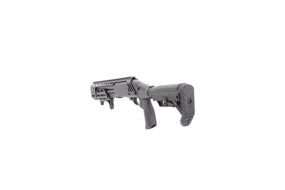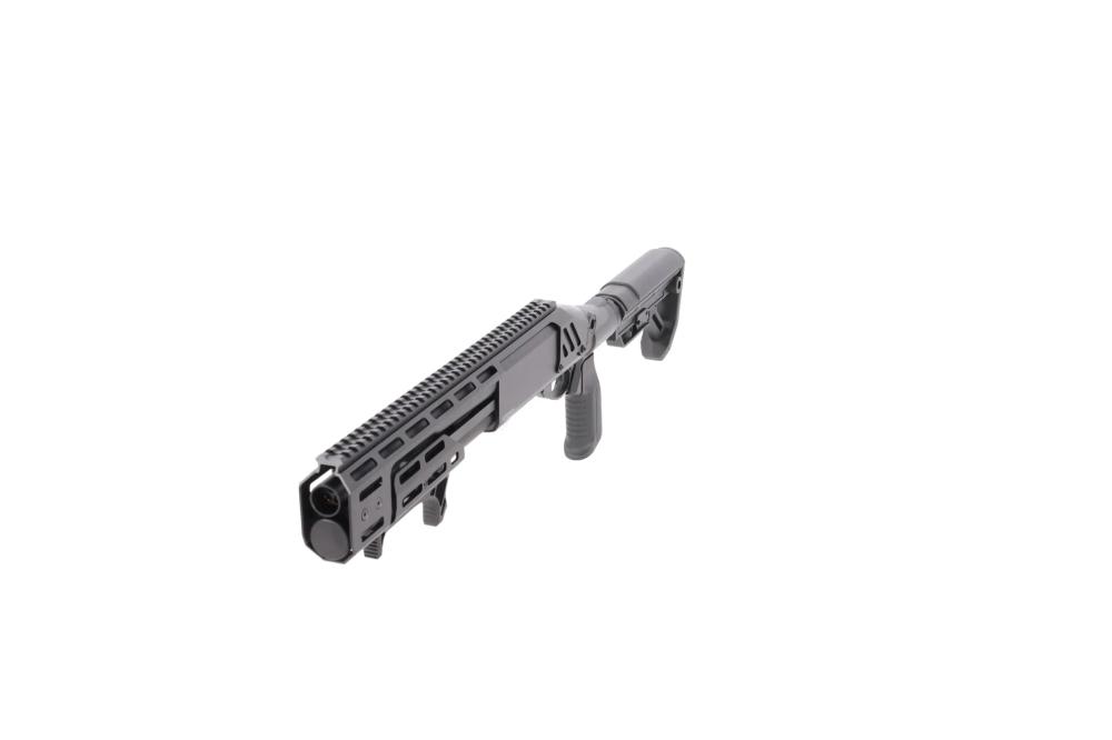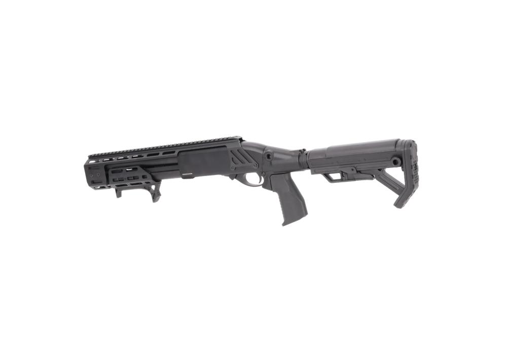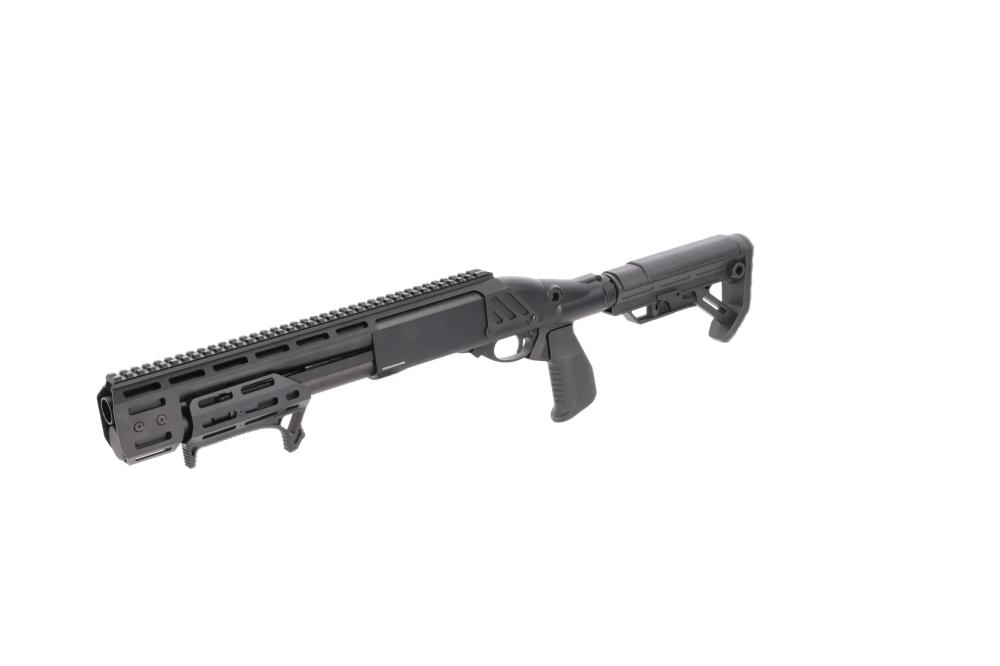 Pump-action sustav s metalnim, M-LOK kompatibilnim prednjim rukohvatom, koji ima integrirani kosi (angled) grip za sigurniji i brži zahvat pri repetiranju.