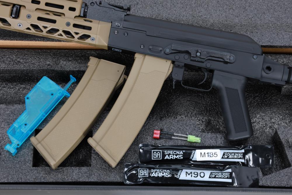 U pakiranju se nalazi: 2 × mid-cap S-MAG spremnika, M135 dodatna opruga, M90 dodatna opruga, replika, šipka za čišćenje, Small Tamiya – Deans adapter i speedloader za kuglice. Baterija i punjač nisu uključeni te ih je potrebno nabaviti zasebno.
