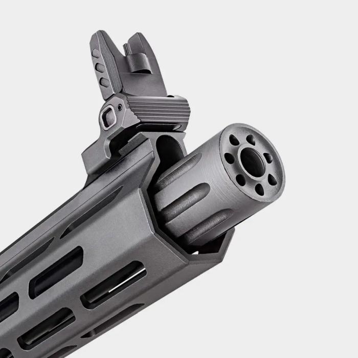 Kompaktan, ali učinkovit kompenzator smješten ispod prednjeg rukohvata, smanjuje podizanje cijevi i povratni trzaj.