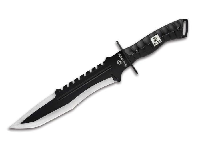 Oštrica je izrađena od 3Cr13 nehrđajućeg čelika s upečatljivim dvobojnim finišem i nazubljenjem na leđima oštrice, koje je savršeno za rezanje užadi ili prepreka. Teksturirana drška od polipropilena nudi sigurno prianjanje u svim vremenskim uvjetima, a dodatno je ukrašena USMC logotipom. Veliki štitnik štiti ruku tijekom upotrebe i zajedno s rupom za vezicu pruža skladan izgled i dodatnu funkcionalnost.